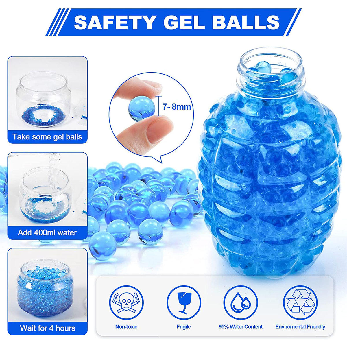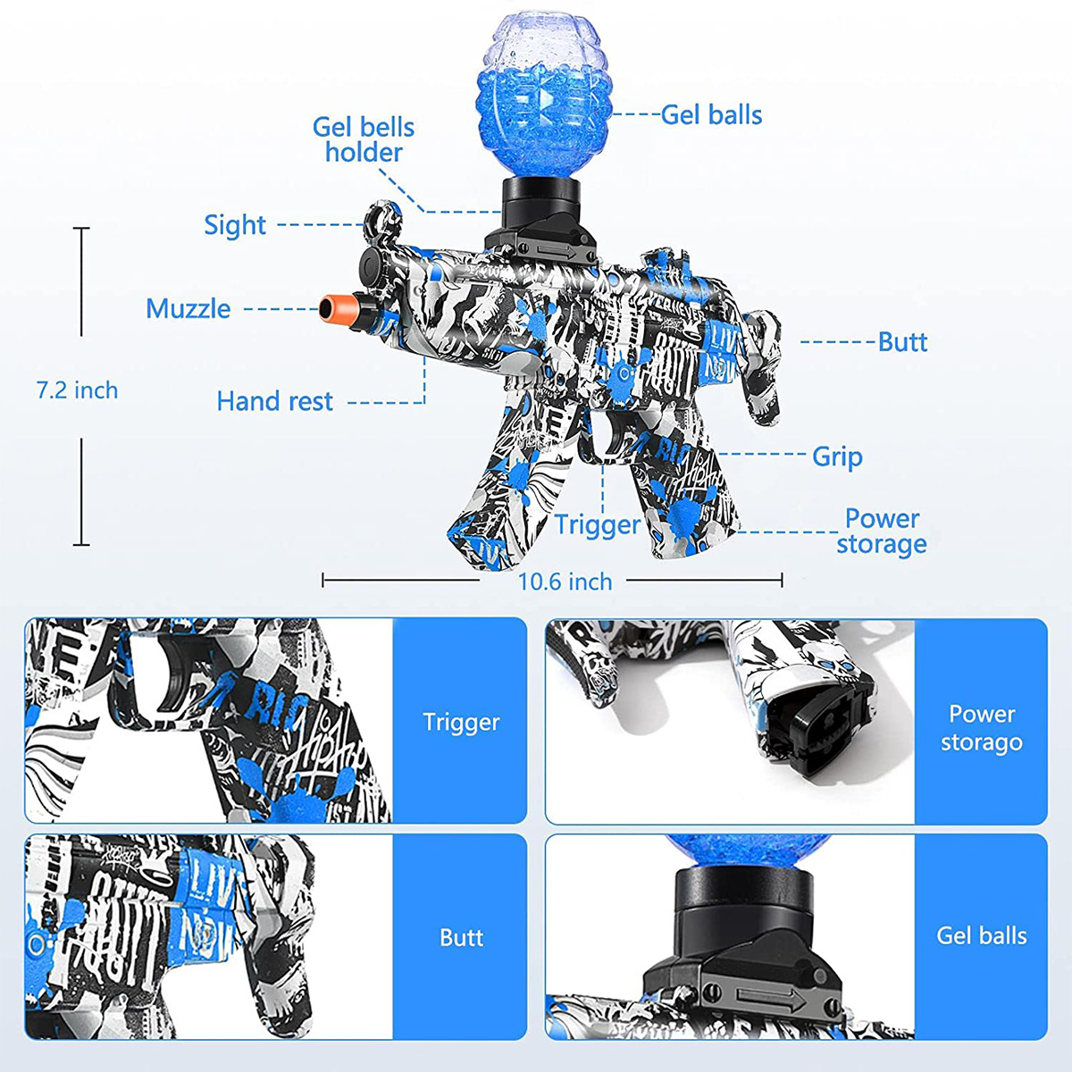- Lieferumfang: 1 MP5 Gelp-Kapsel Spielzeugpistole, 1 Wasserbombenschacht, 1 Gel-Kapsel Packung, 1 Lithium-Ion Akku-Batterie, 1 USB-Ladegerät, 1 Schutzbrille, 1 Gebrauchsanleitung