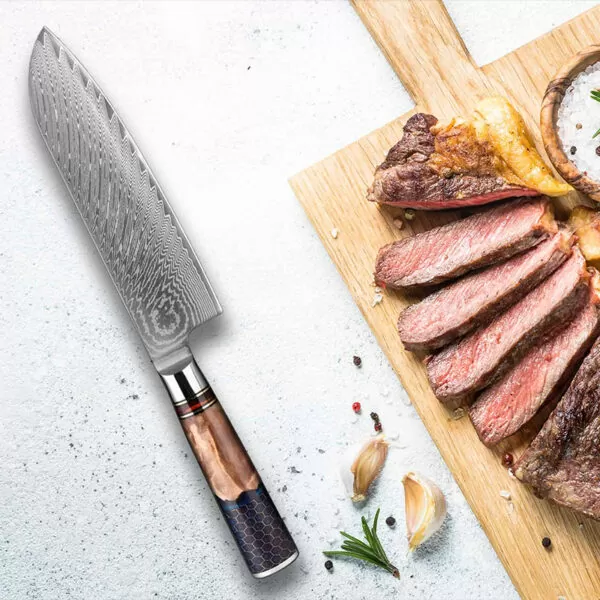 Dieses Damast-Santoku-Messer ist etwas ganz Besonderes – dieses Santoku-Messer ist einzigartig und wird dank seines auffälligen, blau gefärbten Holzgriffs ein Blickfang in Ihrer Küche sein. Das Santoku-Messer ist nicht nur scharf, sondern auch robust und langlebig.