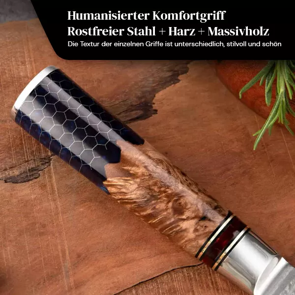 - Die Damaszener Küchenmesser sind Unikate, die jede Küche aufwerten. Jedes Messer ist durch den individuell gefärbten Holzgriff ein Unikat und sorgt so für eine besondere Optik beim Kochen.