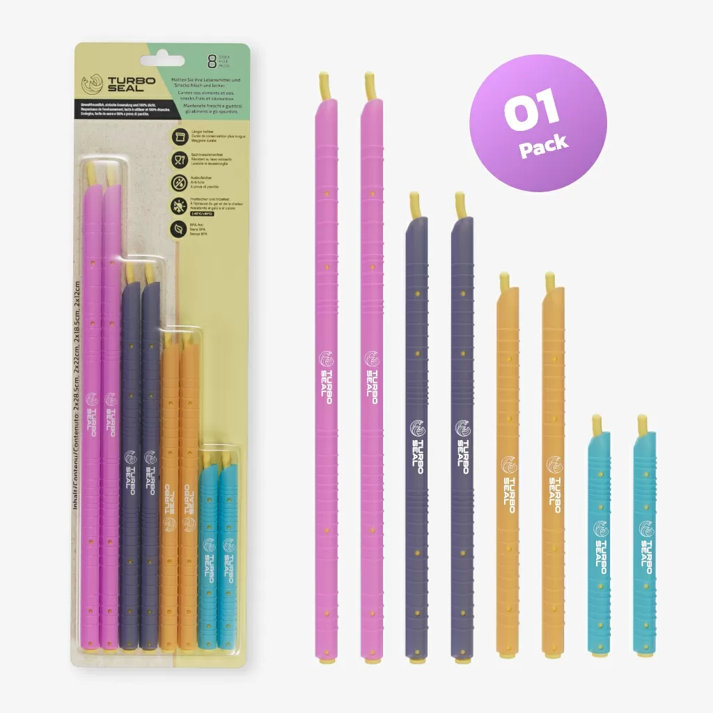 Der TurboSeal 1-Pack enthält acht Verpackungsclips in vier verschiedenen Größen: 12 cm, 18,5 cm, 22 cm und 28,5 cm. Die Clips sind in den Farben Pink, Grau, Orange und Blau erhältlich und bringen somit auch einen Hauch von Farbe in Ihre Küche.