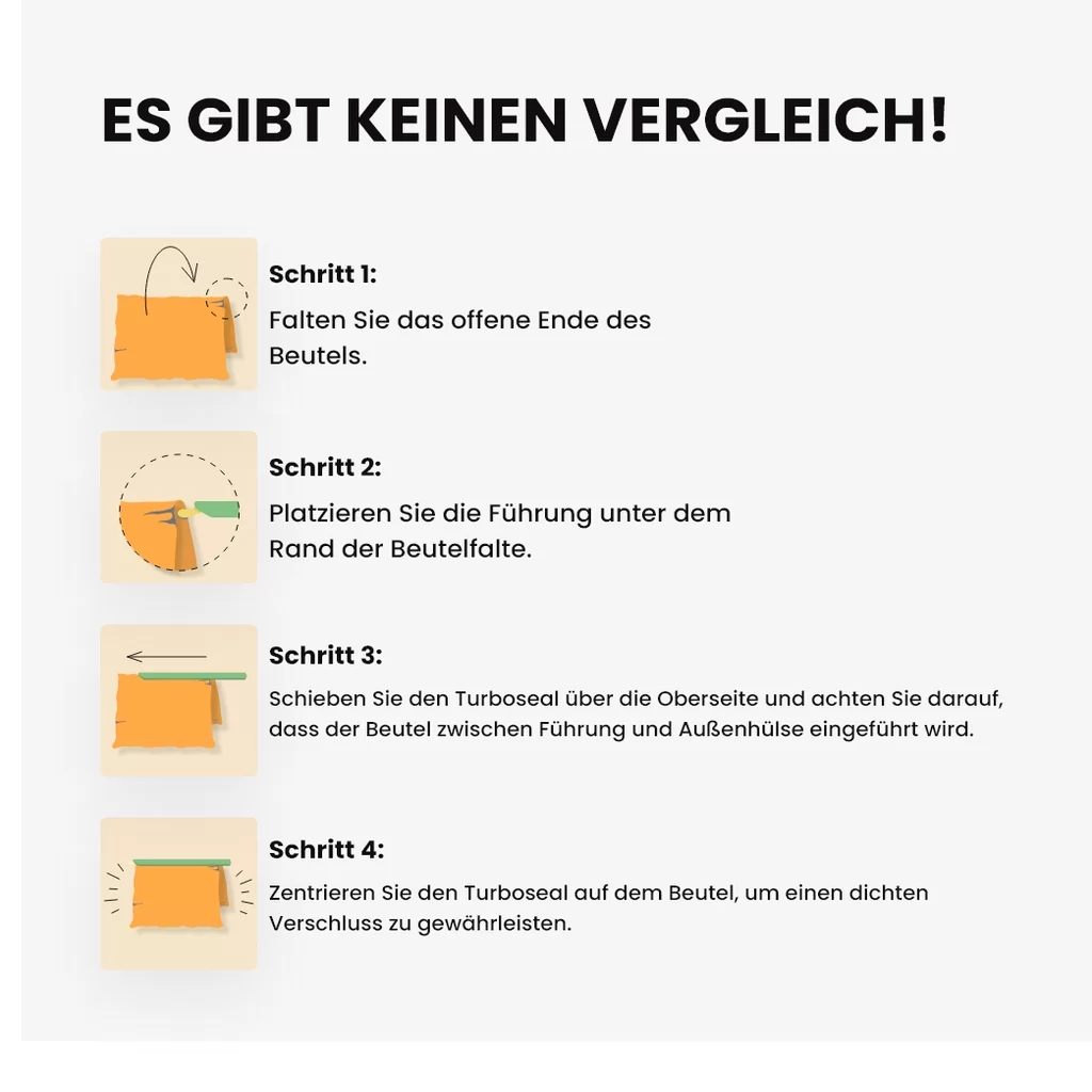Mit TurboSeal können Sie sicherstellen, dass Ihre Lebensmittel länger frisch bleiben. Dies ist nicht nur praktisch, sondern hilft auch, Lebensmittelverschwendung zu reduzieren.